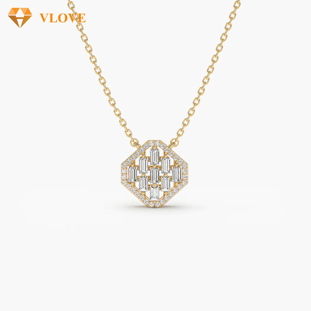 Baguette Diamond Halo Necklace | 14K Gold Spring Collection | Women's Fashion Jewelry with Certified Natural Diamonds | VLOVE