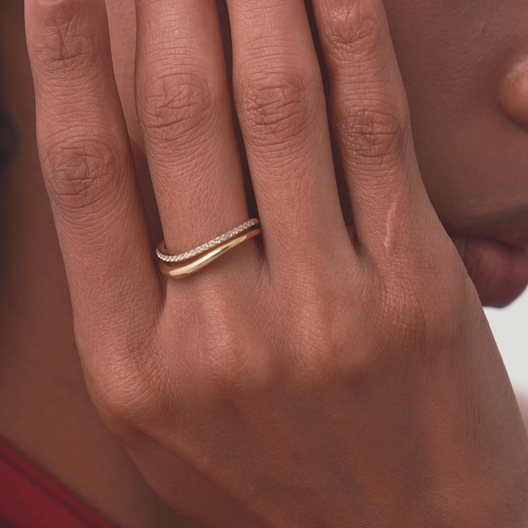 Diamond Wave Ring | 14k Gold Double Band Stackable Ring | Unique Curved Design | Gift for Her